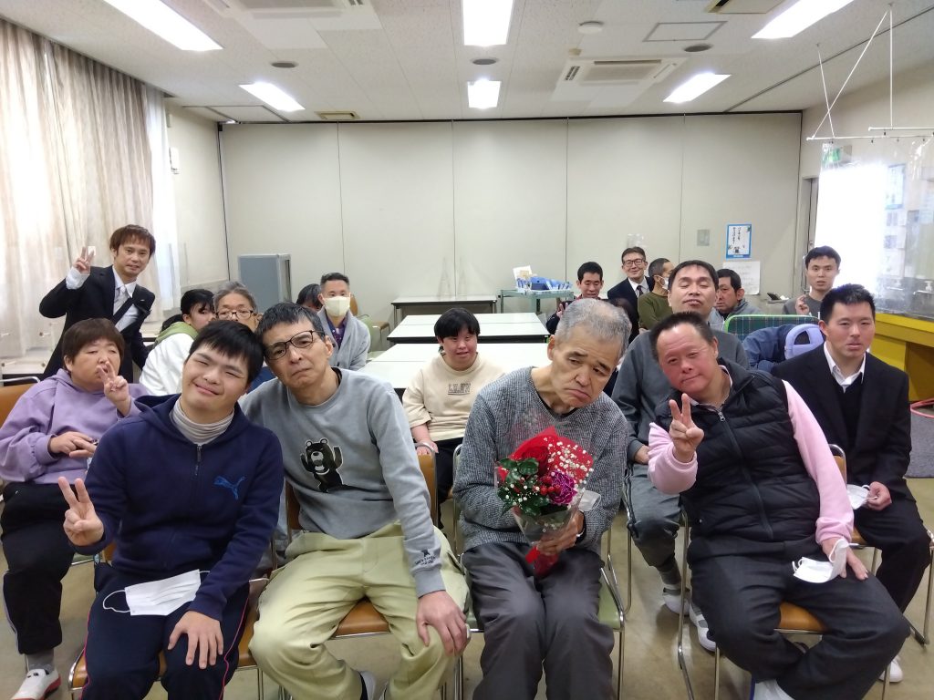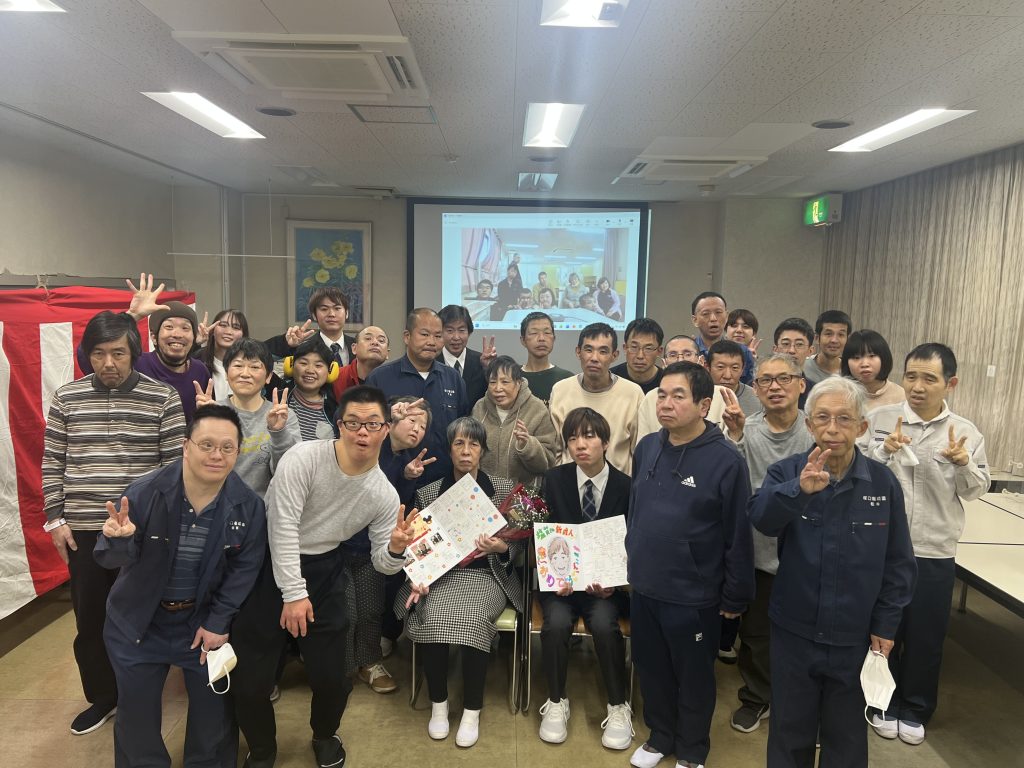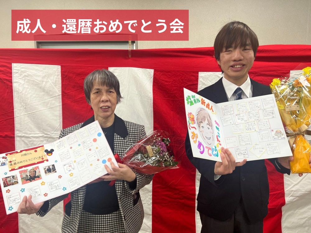 1月 塚口福成園にて成人・還暦おめでとう会を実施しました。今年度は、成人1名、還暦2名のお祝いを七松分場とリモートでつなぎながらおこない、スタッフからのメッセージを書いた色紙と花束をプレゼントしました。