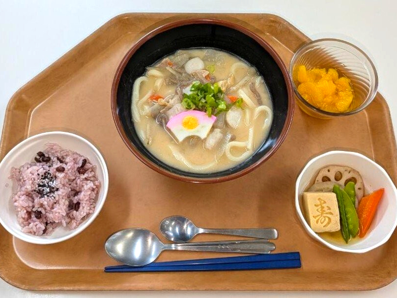 12月24日の昼食では、クリスマスにちなんだ特別メニューを提供しました。ホワイトソースオムライスにはドライパセリと星型の人参を添え、見た目にも華やかに仕上げました。ミネストローネとチキンナゲットを組み合わせ、彩り豊かなクリスマスランチとなりました。1月5日の昼食は、今年最初の開所日にふさわしく、お正月らしい行事食をご用意しました。お赤飯に、寒い季節に体が温まるかす汁うどんを合わせ、新年の雰囲気を感じていただける献立を提供しました。