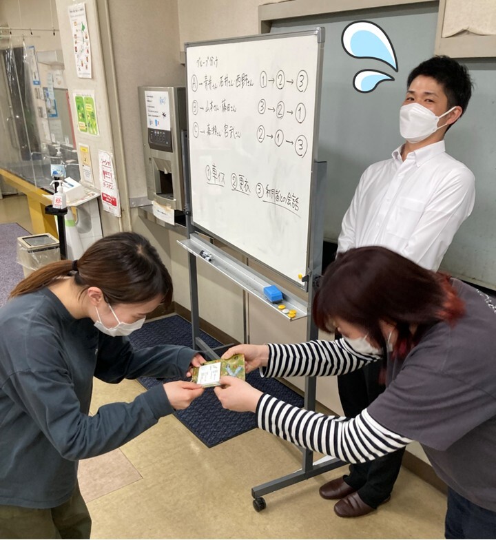 当日は、9名の対象スタッフ全員参加で、入職してからの個々の想いや不安などを共有する事で「ヨコ」の繋がりが更に深まりました。具体的な内容としては、①福成会に入ってから楽しかった事や嬉しかった事、楽しみなど ②仕事をしていて困った(困っている)事や不安など③思い描いていた事と、実際に仕事についてみてのギャップ④これからの目標、一年後の自分がどうありたいか。の4項目を順番に自由に話し合いました。「楽しかった事や嬉しかった事」では、利用者支援上の内容が多く、「利用者さんから話しかけてくれた。」「名前を呼んでくれた。」など利用者さんとの関りの中での喜びを共有しました。研修の最後には、ちょっとしたサプライズを用意されており、参加者からは笑顔がこぼれていました。(どんな内容かは福成会入職後のお楽しみ!)