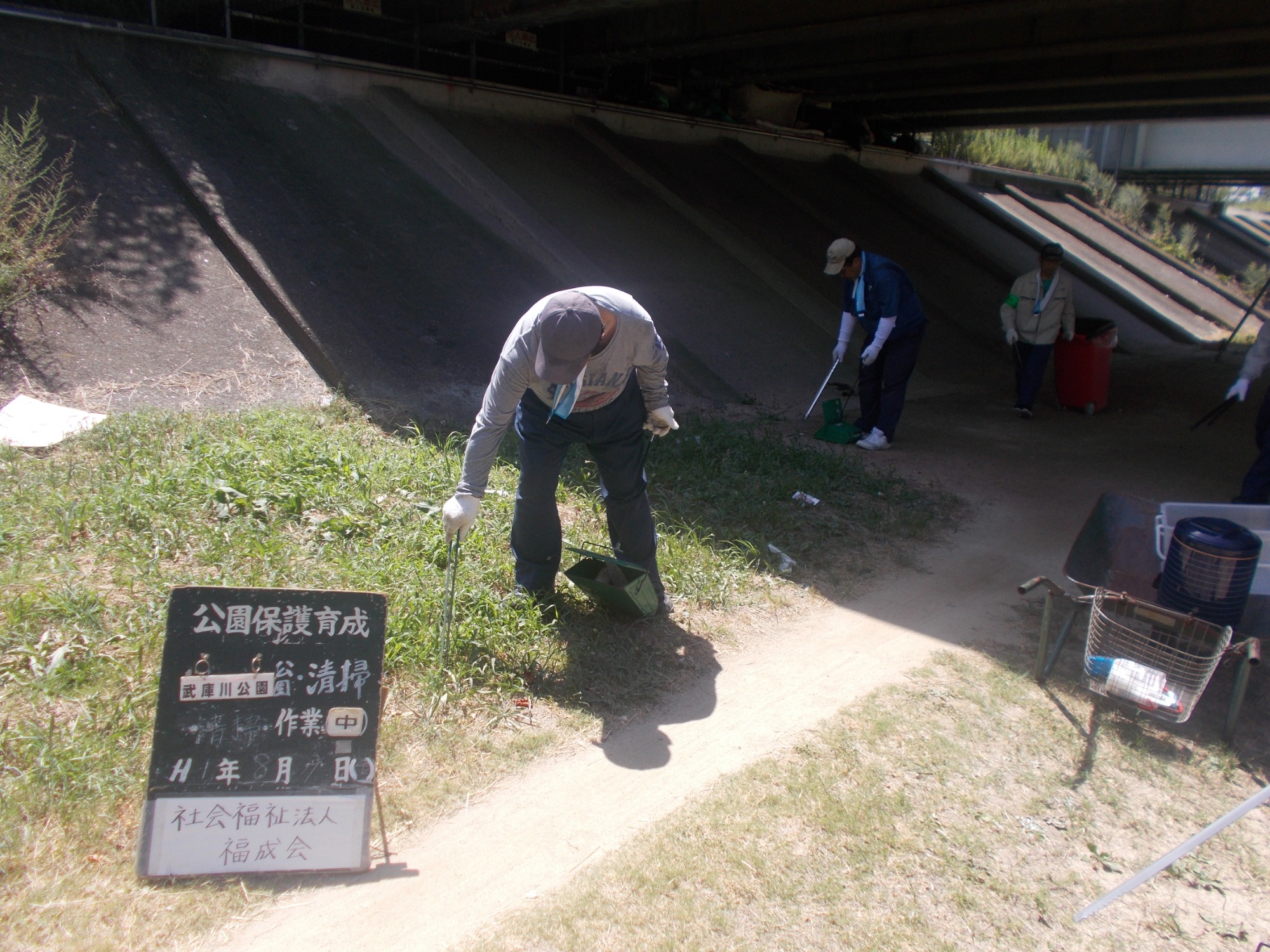 尼崎市からの委託を受けて水明公園と武庫川河川敷のごみ拾いや落ち葉清掃を行っています。
